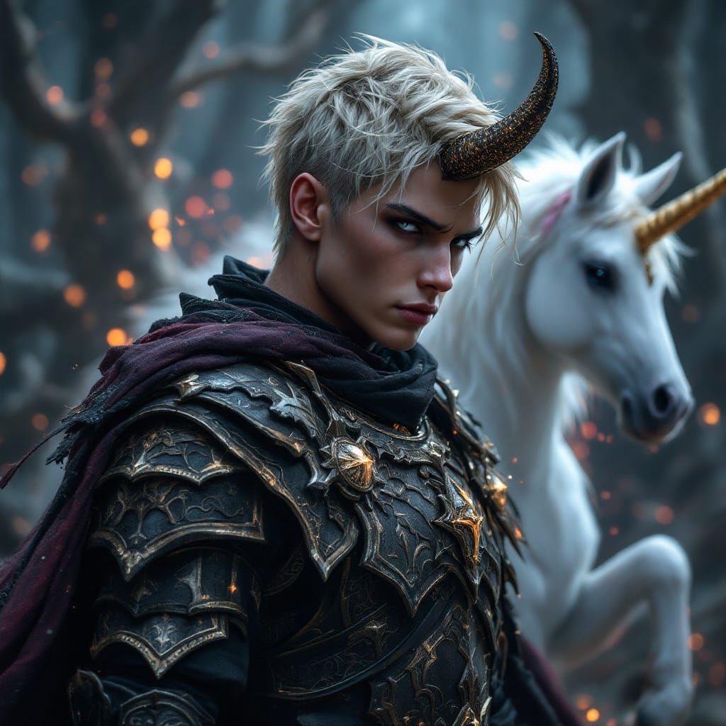 A powerful Goth Barbarian stands in a mystical, dark landscape, adorned in intricate armor and a glowing horned helmet, surrounded by a white chibi unicorn and rich, deep colors, evoking a sense of high-fantasy world-building.