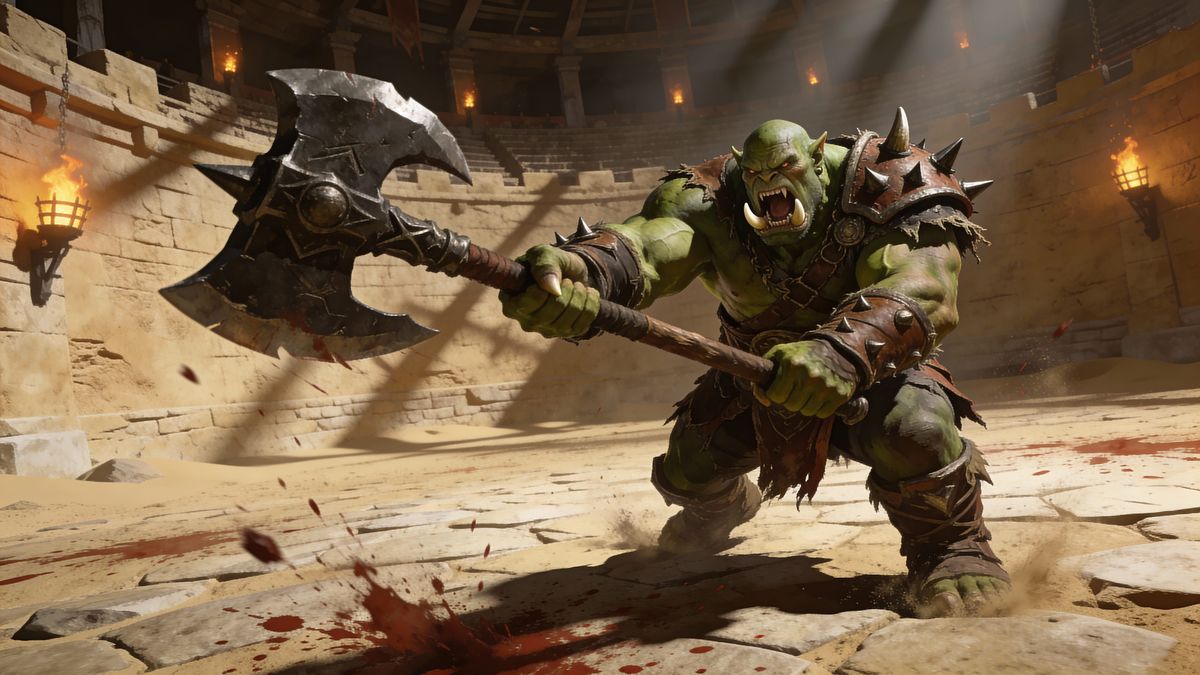 A powerful orc warrior stands ready in an arena, gripping a large battleaxe. The image captures the intensity of a fierce gladiatorial confrontation.