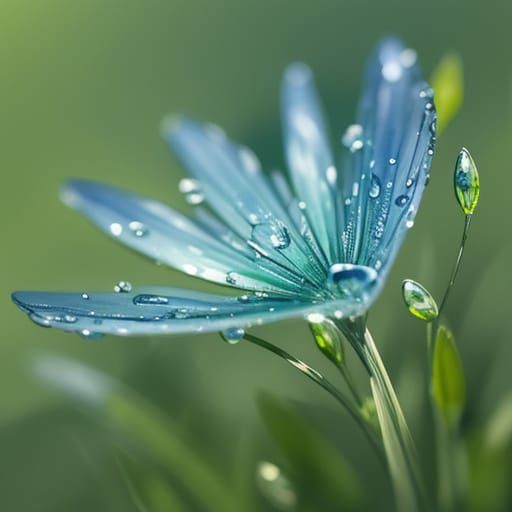 This image shows a close-up macro view of a single dewdrop on a grass blade, rendered as a vibrant watercolor painting with iridescent reflections and soft bokeh.