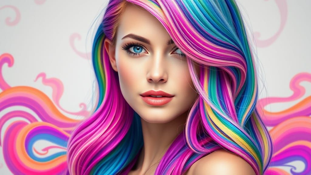 This image features a young woman with a subtle, enigmatic smile and striking blue eyes, surrounded by a kaleidoscope of rainbow-hued hair against a soft, gray backdrop with fractal patterns, created in a hyperrealistic art style