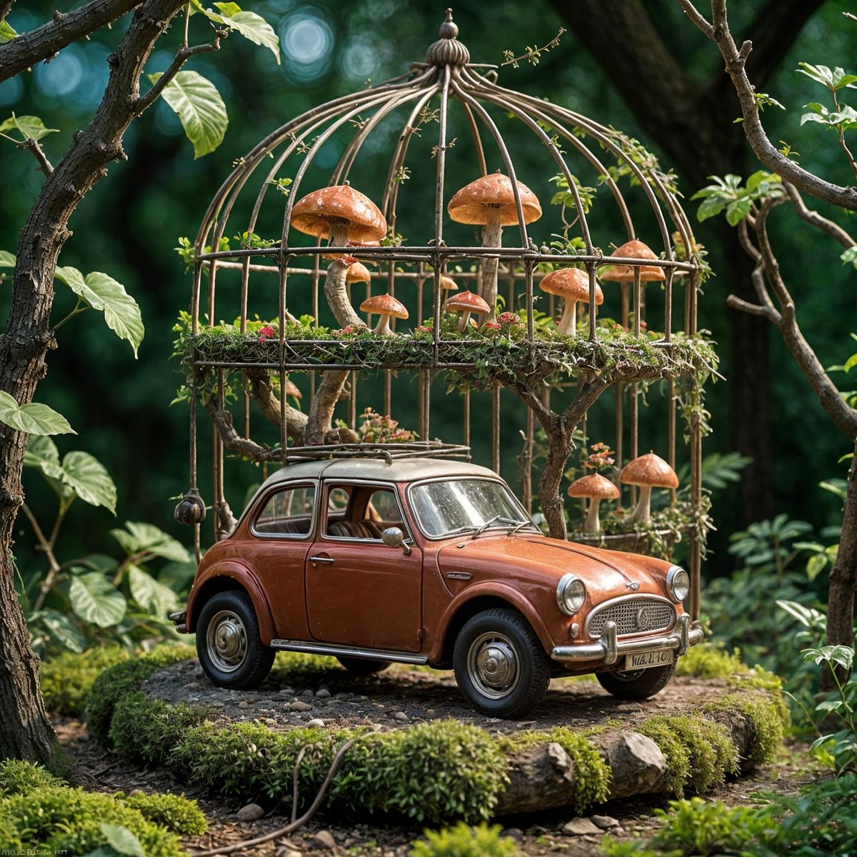 This image shows a meticulously crafted miniature world inside a birdcage, featuring a vintage car being repaired by a small troll amid twisted trees and glowing mushrooms. The aesthetic is hyperrealistic with vivid colors.