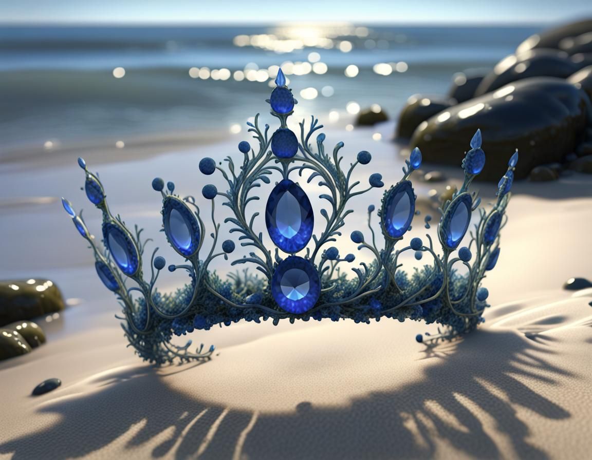 This image shows a sapphire tiara adorned with seaweed, resting on a sandy shore. It's rendered as detailed digital art.