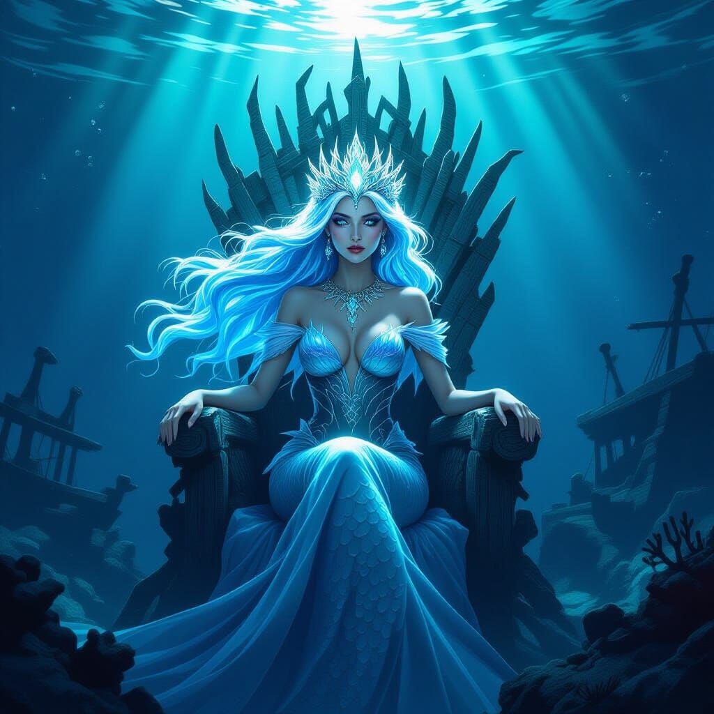 This image shows a majestic mermaid queen with glowing hair and a coral crown on a throne of shipwrecks in a deep-sea trench. The art features vivid blues and glowing highlights with cinematic lighting.