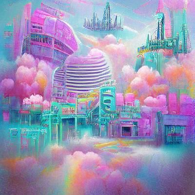 This image shows a cyberpunk city with pastel colors and magical elements. The aesthetic combines futuristic technology with soft, dreamlike hues.
