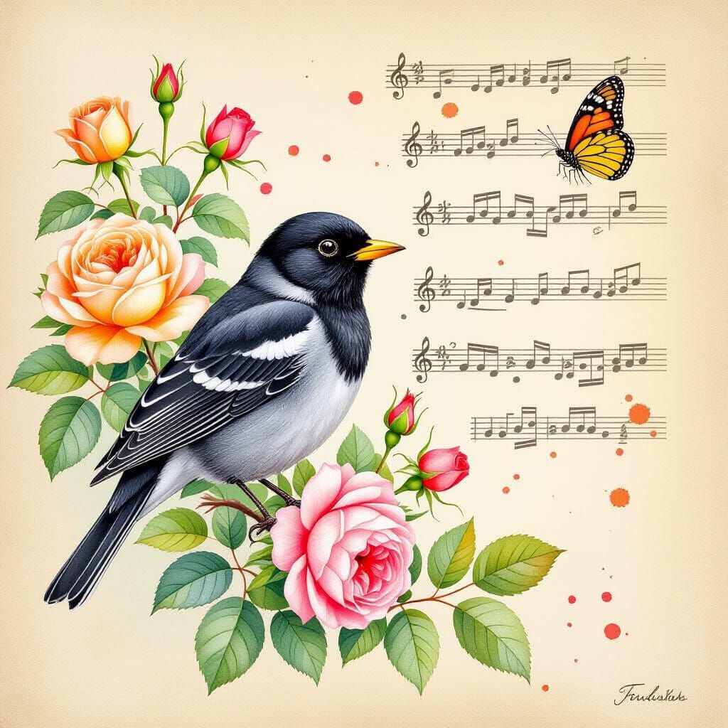 This image shows a detailed watercolor painting of a blackbird with a yellow beak nestled among orange and pink roses, with a musical score background and scattered notes. Features soft lighting and intricate details.