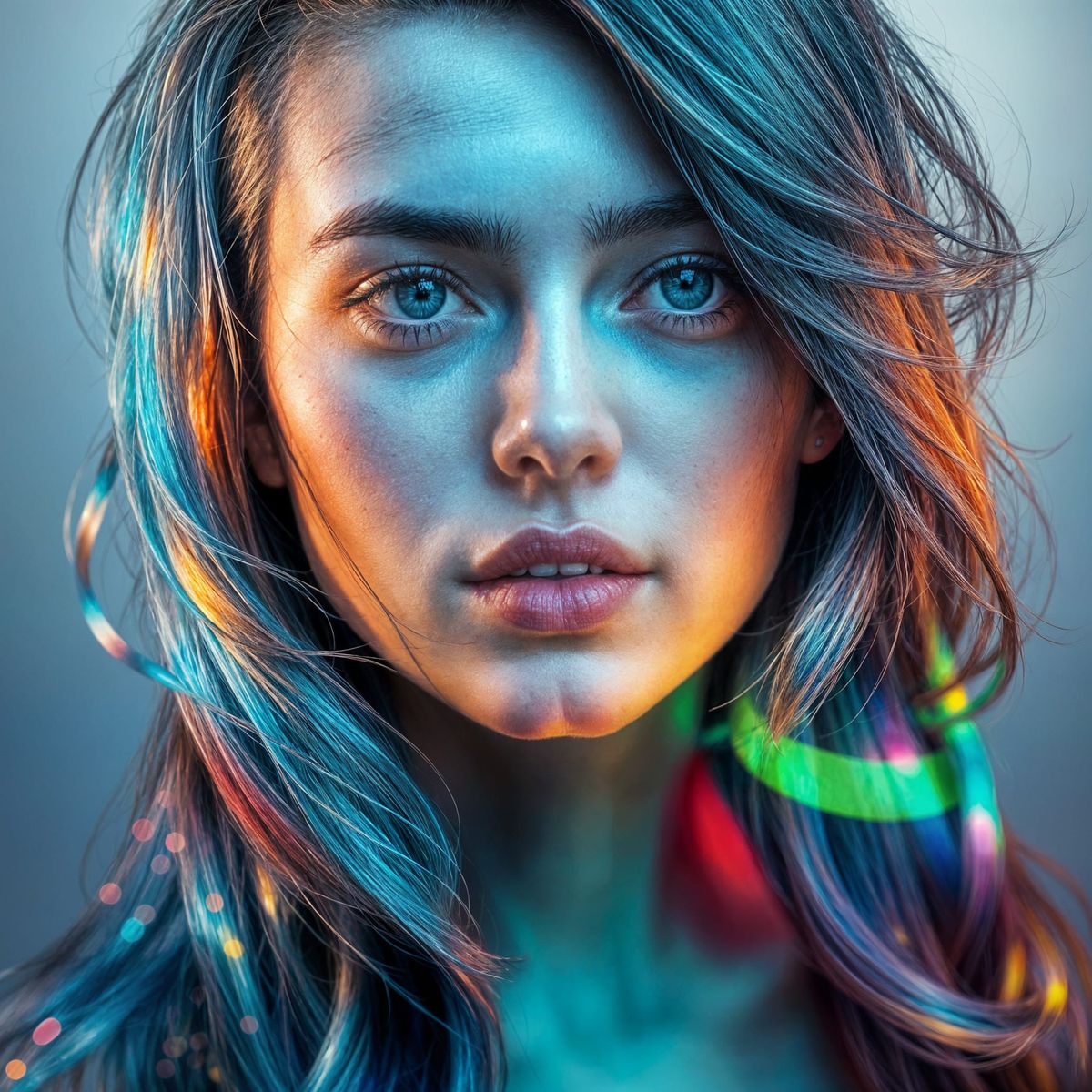 This image showcases a captivating portrait of a woman with hair that shimmers and changes into a kaleidoscope of colors, creating a breathtaking effect with a mesmerizing display of color and light.
