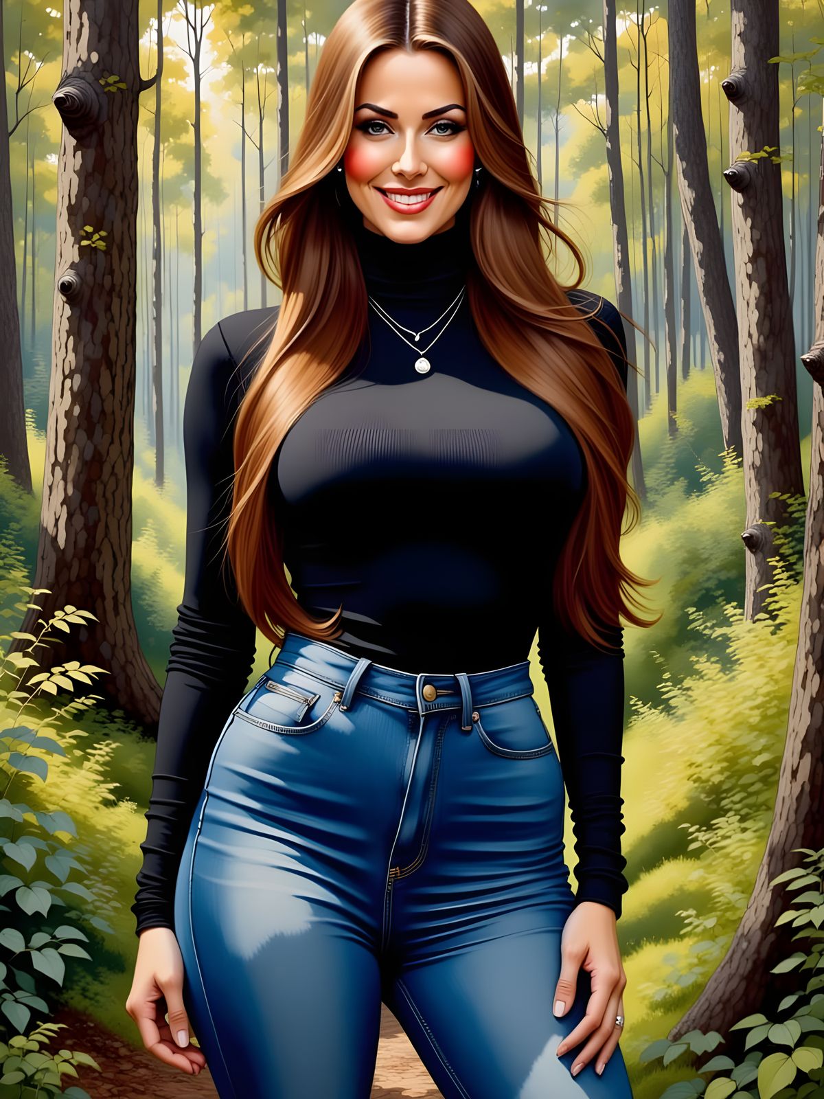 This image shows a beautiful, heavy woman with long brown hair in a forest setting. She is wearing a black turtleneck, high-waisted denim hotpants, and opaque pantyhose, depicted as a detailed oil painting.