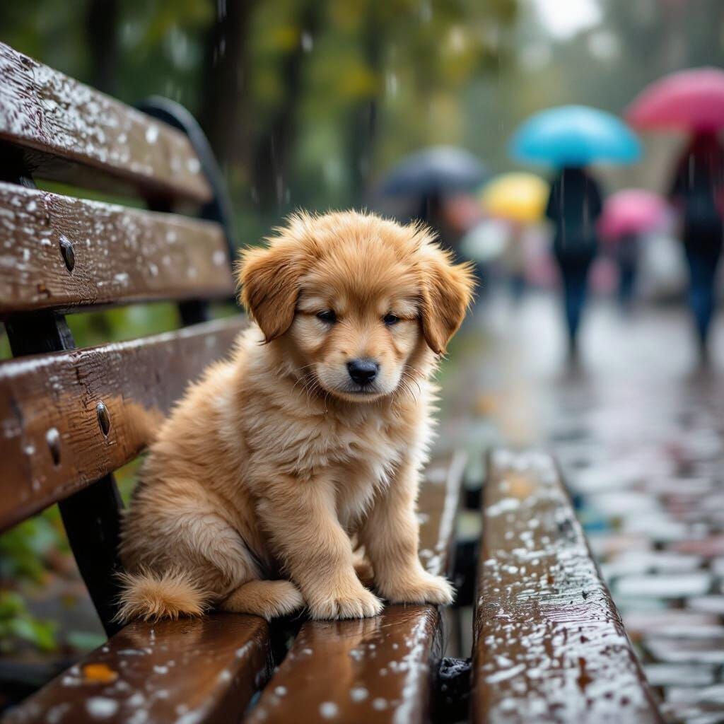 A photograph of a small, fluffy orange puppy nestled close to a timeworn wooden bench during a downpour. The puppy's fur is damp and plastered to its body, highlighting its soft, rounded form, with its tail curled protectively around its paws. Large, soulful brown eyes are closed, its ears drooping slightly, emphasizing a vulnerable posture against the backdrop of the storm. Raindrops glisten on the benchโs surface and the surrounding cobblestone path, where blurred figures with colorful umbrellas hurry past, creating a sense of gentle motion and contrasting the puppy's stillness.