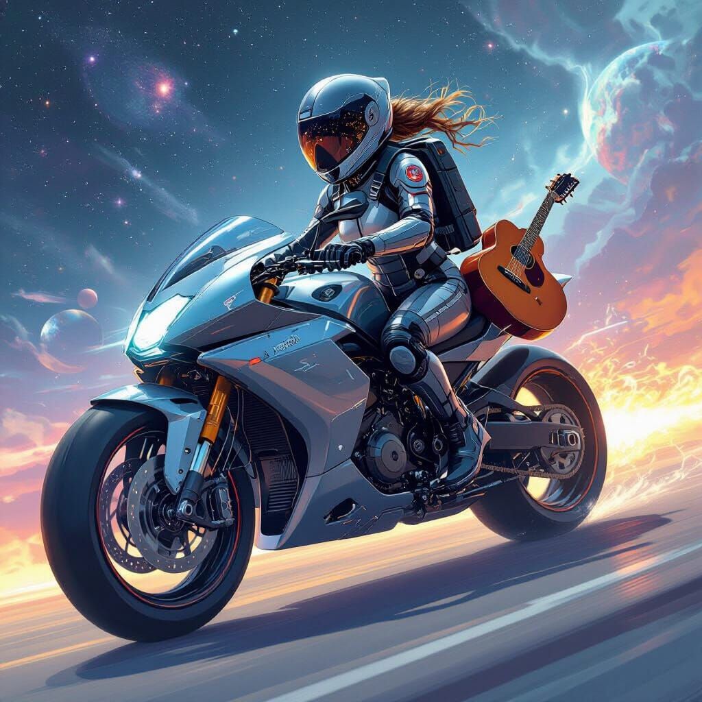Female Guitarist Astronaut Rides Space Motorcycle With Guitar On Shoulder To Infinity