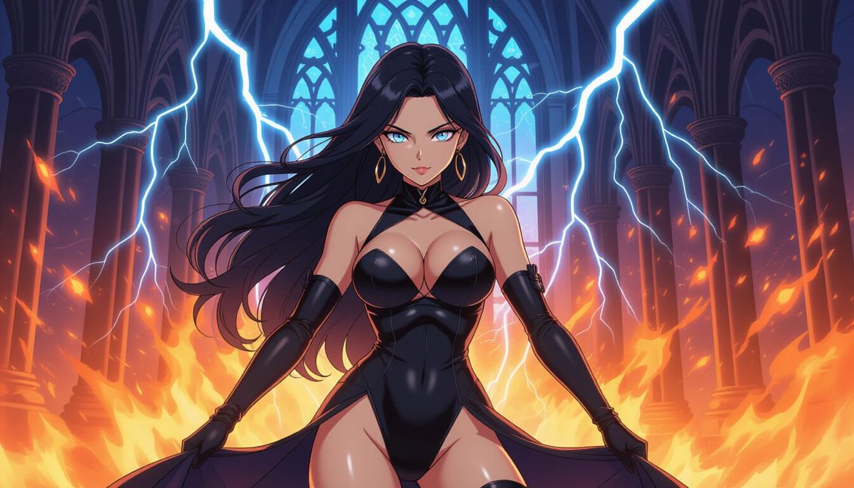 A vibrant anime-style image of a young Dominican woman with long black hair, posed heroically amidst roaring flames and lightning. The scene is set in a majestic magical palace with gothic architecture.