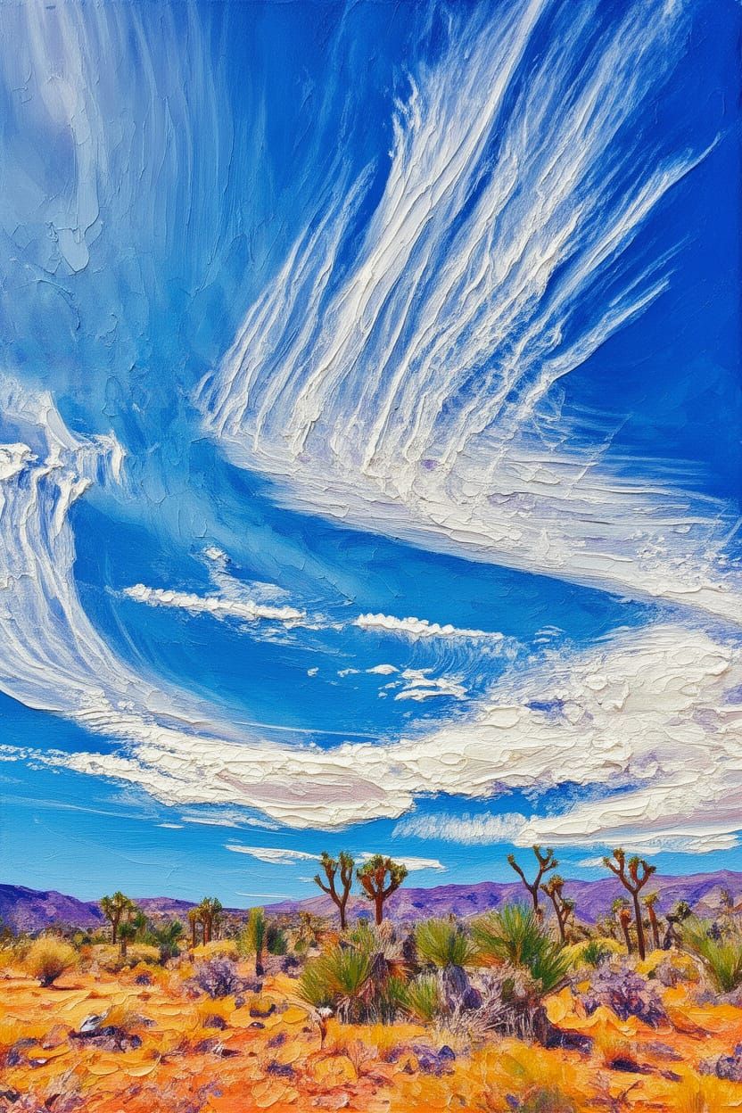 Beautifully patterned cirrus clouds in a blindlingly blue sky over the Mojave desert dotted with Joshua trees neo-impressionism expressionism