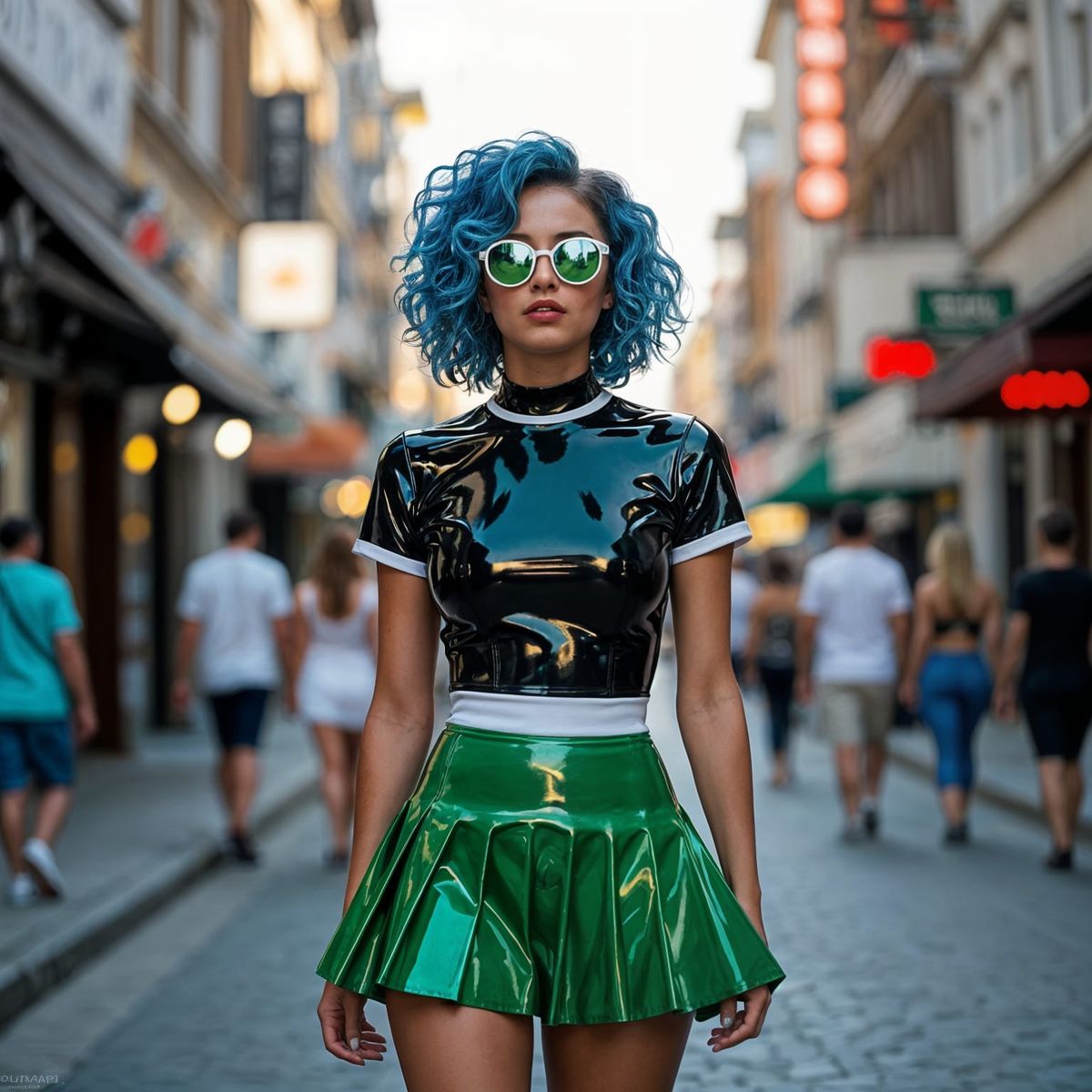Young woman with blue hair wearing a bold latex outfit in an urban setting.