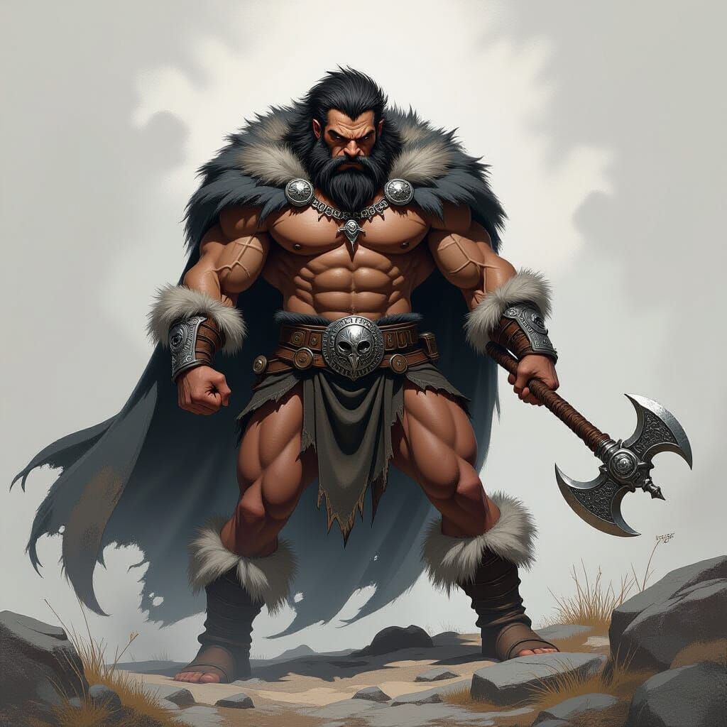 A striking picture of a powerful barbarian warrior cloaked in wolf fur. The image captures a dramatic pose reminiscent of classic dark fantasy art.