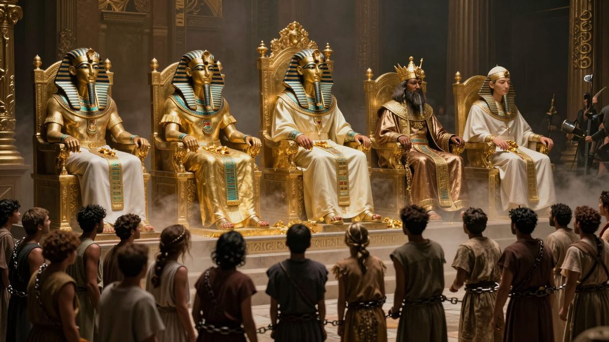 This image shows ancient rulers on immense golden thrones, overseeing suffering citizens. It highlights the stark contrast between power and misery, with dramatic lighting and ultra-realistic detail.