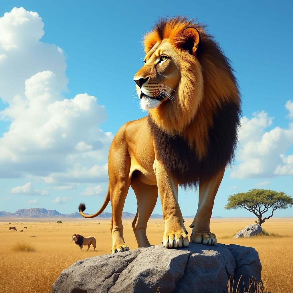 This image depicts a majestic lion standing proudly on a rocky outcrop, surveying its kingdom. The lion's golden mane flows in the breeze, set against a vibrant, sun-kissed savanna landscape with acacia trees and rolling hills.