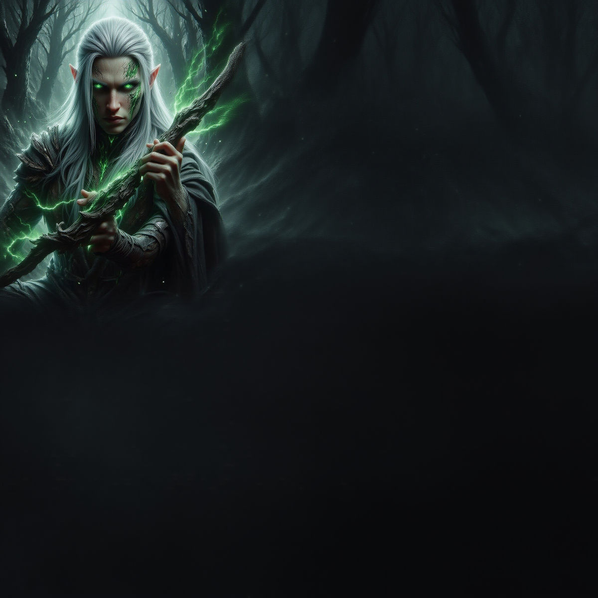 This image shows a male elf with long white hair and green eyes, holding a longbow. The artwork features deep colors and intricate details, rendered as fantasy concept art.