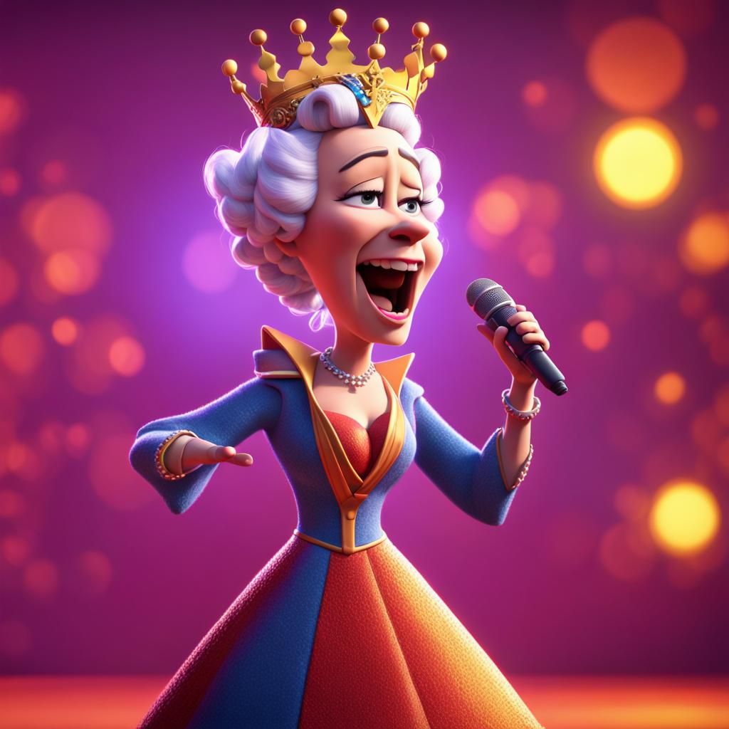 This image shows a queen singing We Will Rock You. The digital 3D art features bright colors, a radial gradient background, and cinematic post-processing.