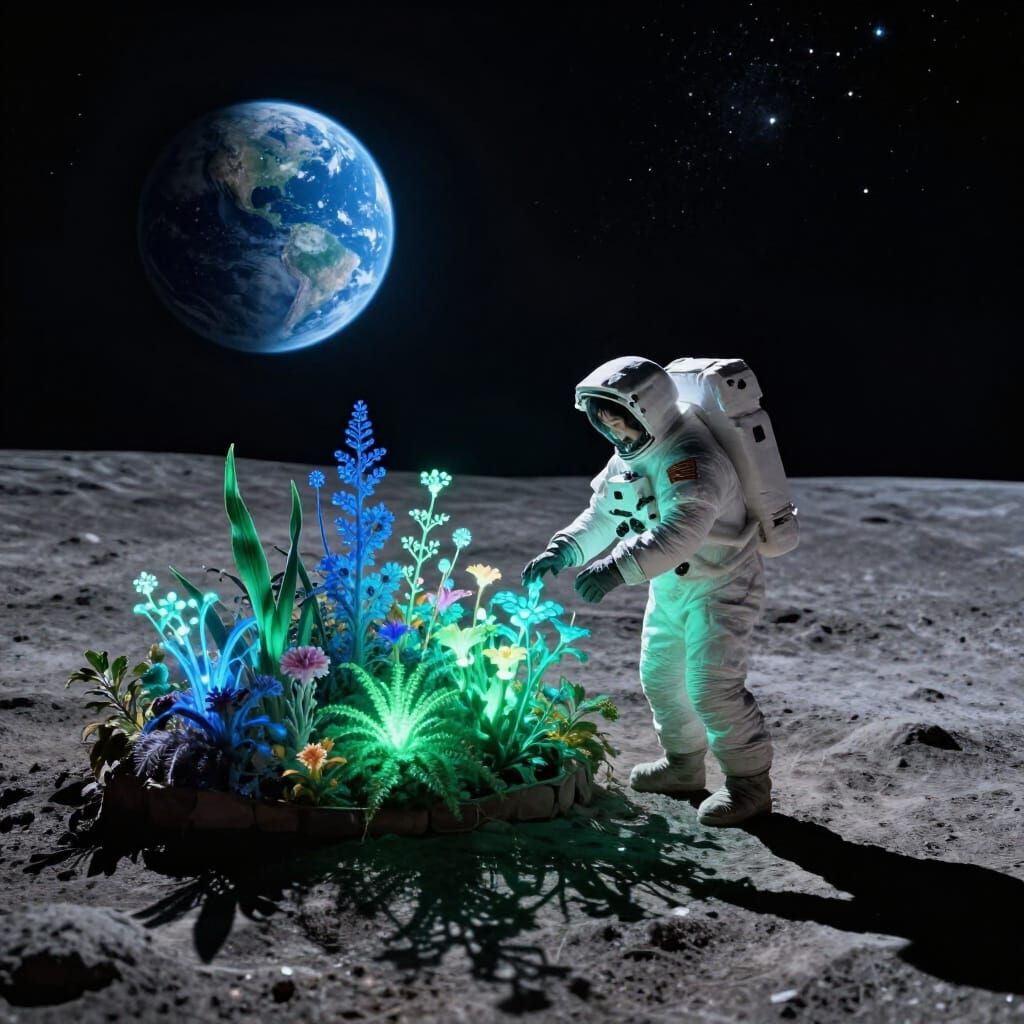 This image shows an astronaut tending a glowing garden on a moon, with Earth visible in the star-filled sky. The scene is rendered in a hyperrealistic, detailed style with cinematic lighting.