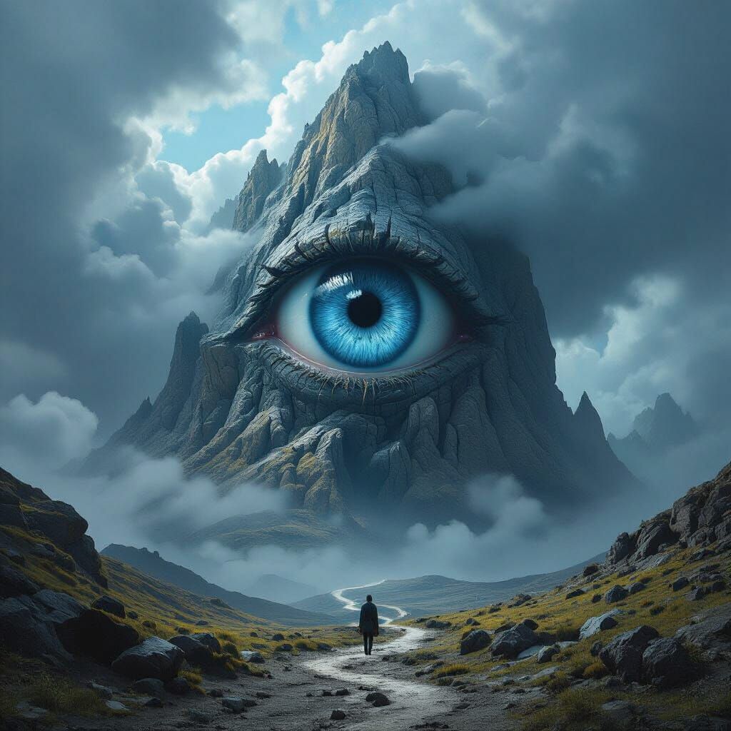 Hiper-realismo, arte surreal em alta definiΓ§Γ£o. Um imenso olho azul-acinzentado integrado a uma montanha rochosa, com nuvens densas e um caminho estreito que leva atΓ© ele. No percurso, surge uma mulher de vestido longo vermelho vibrante, usando colar e brincos delicados com as letras βbgβ gravadas. Atmosfera ...