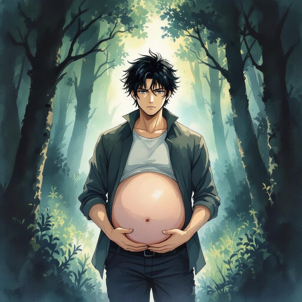 A striking image of a handsome anime man with a pregnant belly, lost in a dark forest. Rendered in an expressive watercolor style with ethereal lighting and a melancholic palette.