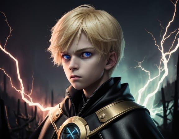 This image shows an eerie child portrait of a boy with glowing voltage eyes and a cape, rendered in a garish and colorful oil painting style with dynamic lighting.