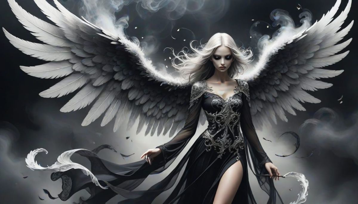 This image depicts a mysterious angel of death surrounded by swirling silver smoke, set against a dramatic backdrop of dark beauty.