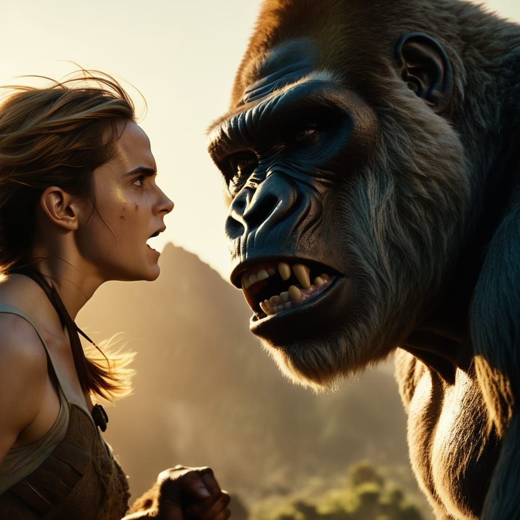 This cinematic film still captures a dramatic and atmospheric scene of a female warrior fighting a giant gorilla, set against warm golden hour tones and deep shadows, with vibrant textures and film grain