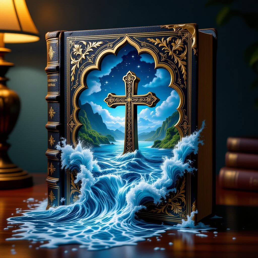 A striking picture of an antique book with a cross on its spine. A vibrant landscape spills from its pages, creating a surreal and captivating scene in hyper-realistic digital art.