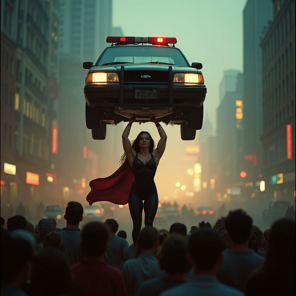 This image shows a superwoman holding a police car above her head. A crowd of scared people watch in the background. The shot is cinematic, with film grain and dramatic lighting.