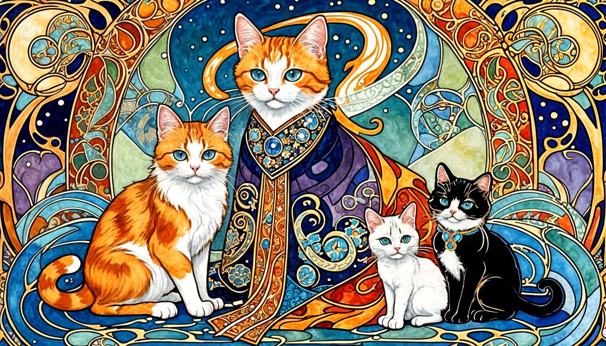 This image showcases calico cats and kittens adorned in ornate imperial garments, rendered in a detailed Art Nouveau illustrative style with swirling decorative elements and vibrant colors.