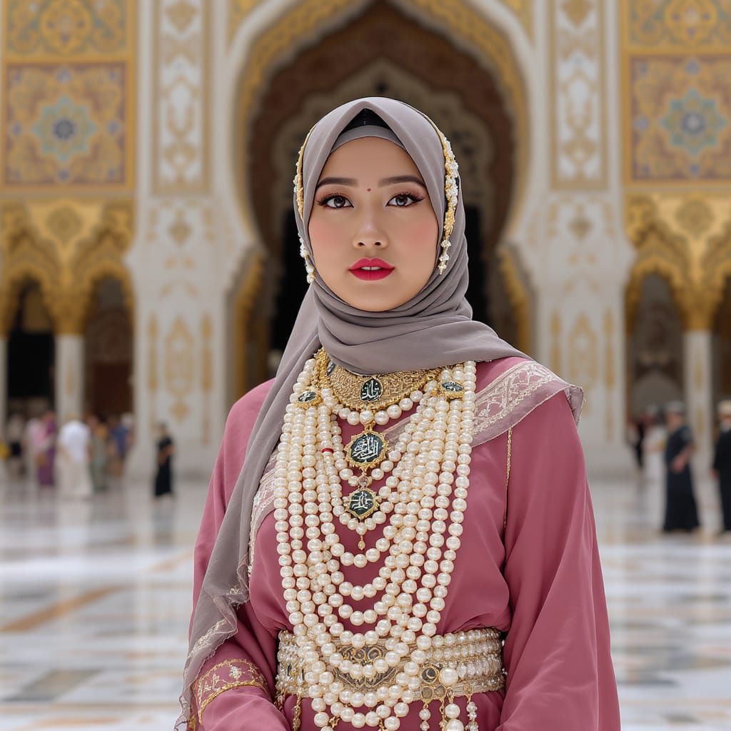This image depicts an Asian woman in a hijab adorned with pearl jewelry, standing before the Ka'bah. The artwork features realistic rendering and vibrant colors.