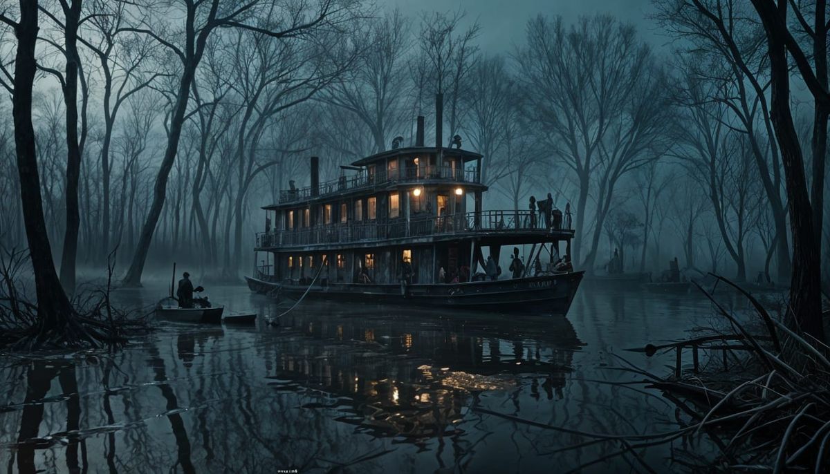 A moody illustration of investigators on a riverboat in the foggy Mississippi Delta, evoking a Southern Gothic horror atmosphere with decayed houses and buzzing insects.