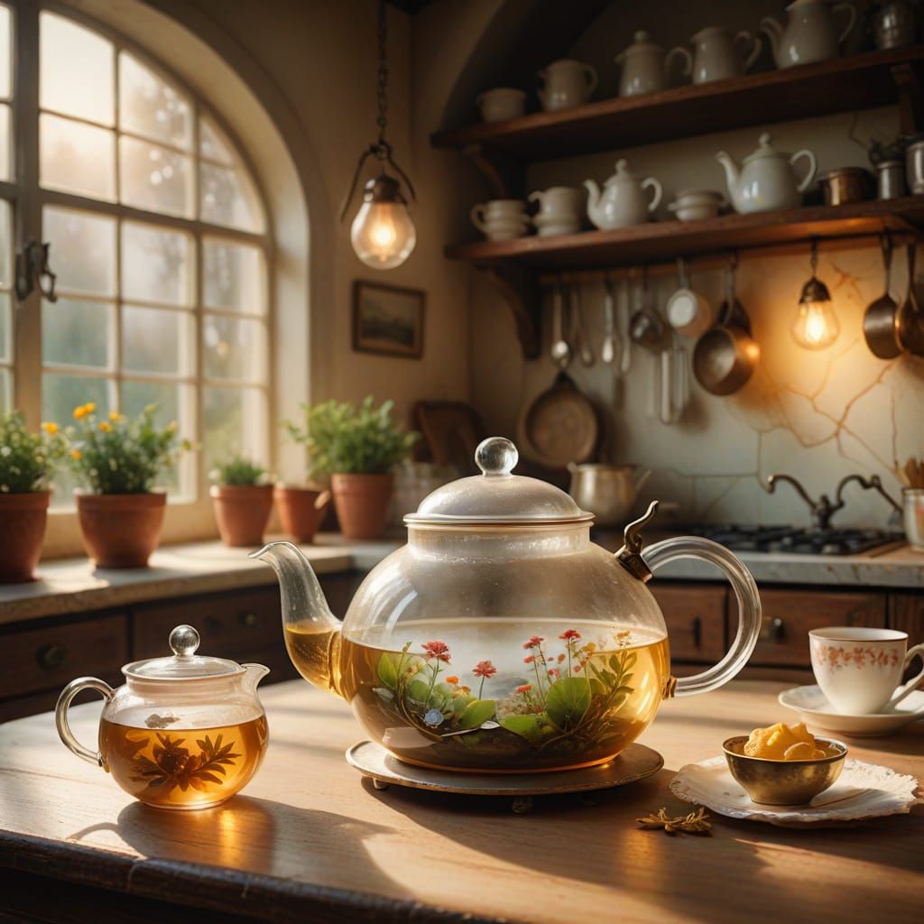 A whimsical concept art image shows a transparent teapot filled with a fairytale landscape, sitting on a table in a vintage kitchen. The artwork is rendered in dreamy watercolor style.