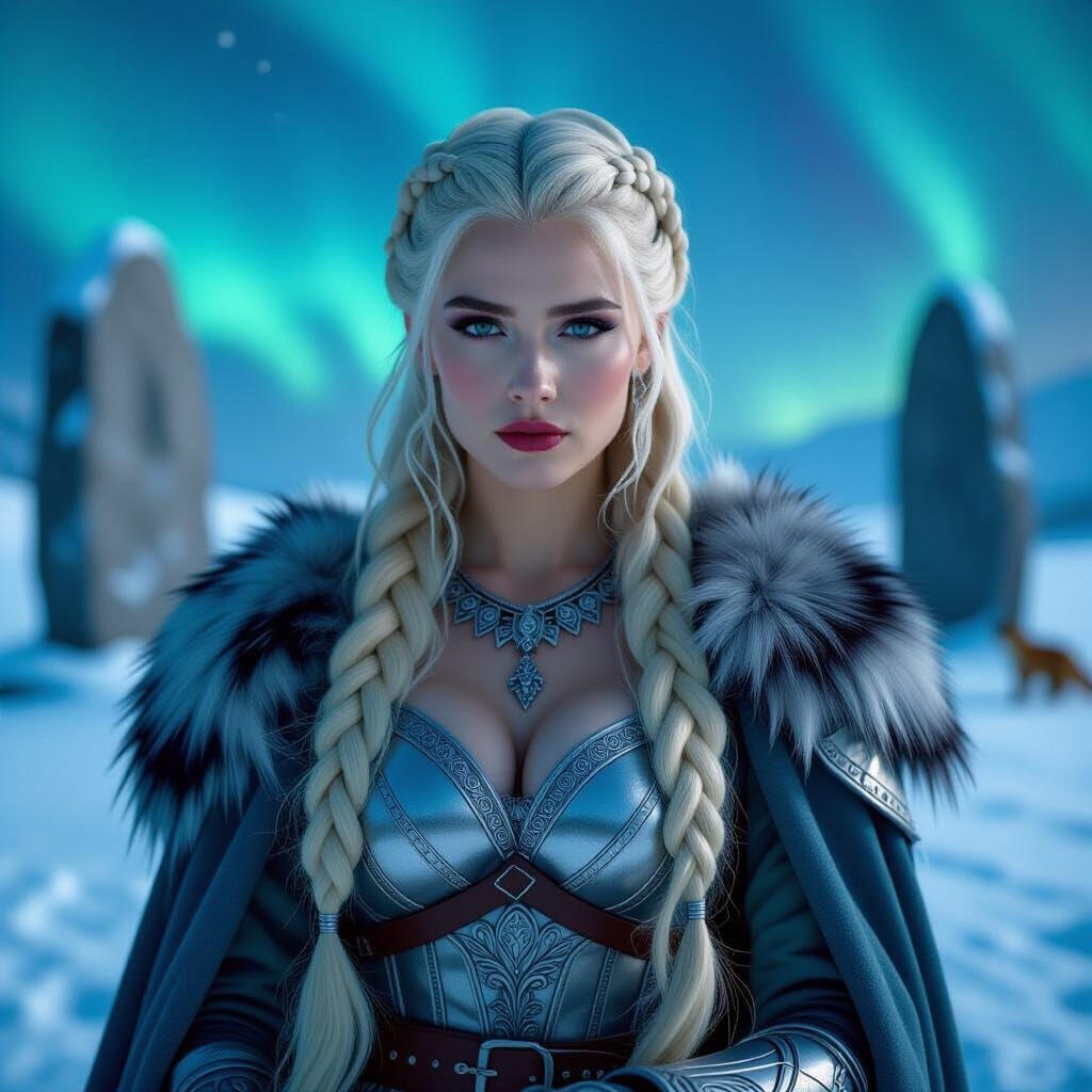 This image shows a striking goddess with braided blonde hair and Viking robes, standing near a megalithic stone circle with a wildcat. The cinematic shot features a full moon and aurora borealis with film grain.