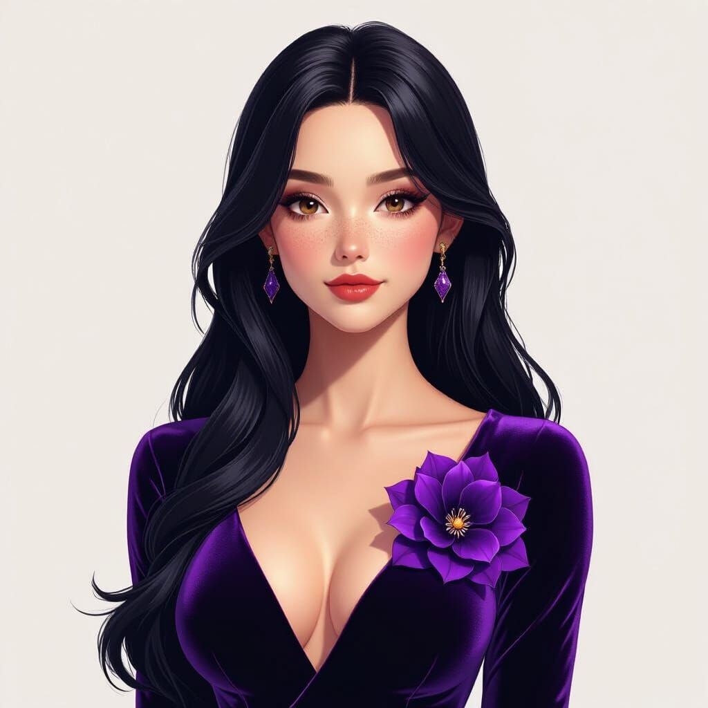 This image shows a fair-skinned woman with long black hair in a velvet dress. The 3D anime art style features ultrafine details reminiscent of Genshin Impact, with a futuristic aesthetic.