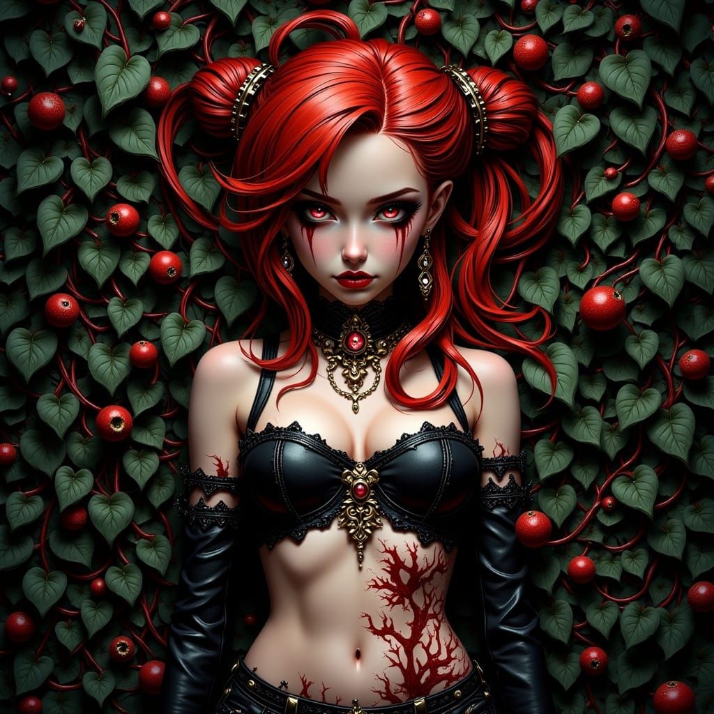 This image shows a red-haired woman entwined with Poison Ivy in a dark, eerie setting. The artwork blends golden patterns with biomechanical and surreal horror elements, rendered with deep contrasting colors and intricate textures.