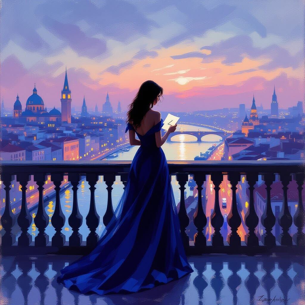 This image shows a woman in a sapphire gown on a balcony, overlooking a city at twilight. Vibrant colors and dramatic lighting capture a mood of romantic longing.