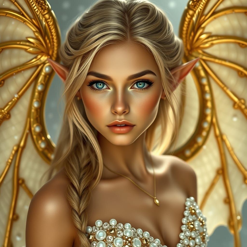 This image depicts a young woman with a heart-shaped face, dirty blonde hair, and striking dark green eyes, adorned with delicate elvish ears and majestic gold wings, set against a background of intricate jewels and flowing white fabric, blending realism and mythic wonder.