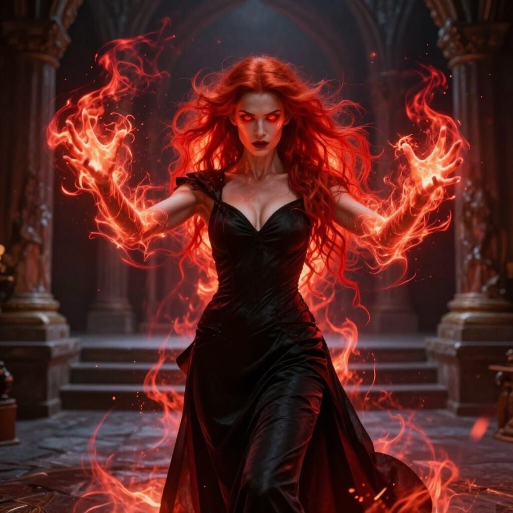 This image depicts a powerful female mage with fiery red hair and eyes, casting intense magical energy. Rendered in a dramatic concept art style with vivid colors.