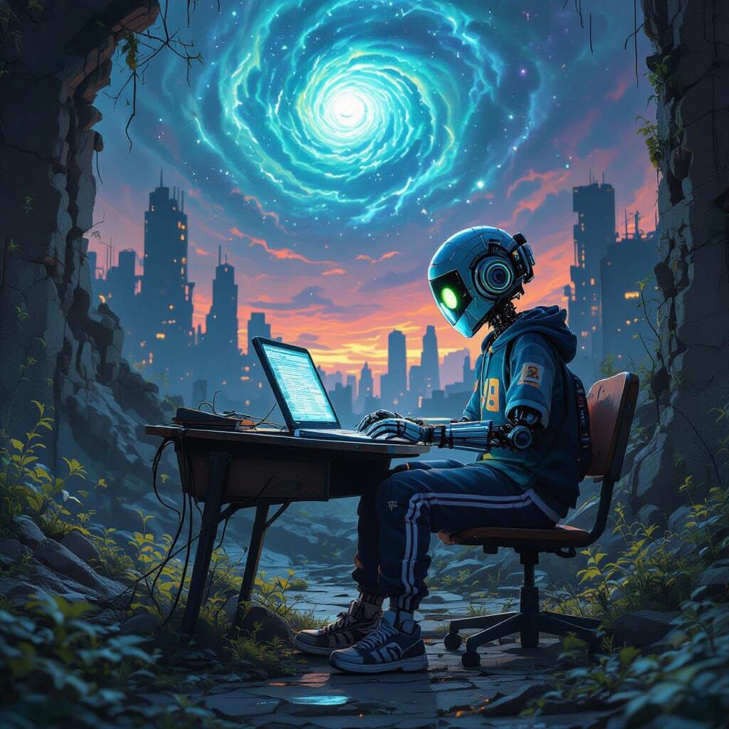 This image depicts a robot student studying on a glowing laptop amidst overgrown, ruined cityscapes. It features a concept art style with deep, atmospheric colors and cinematic lighting.