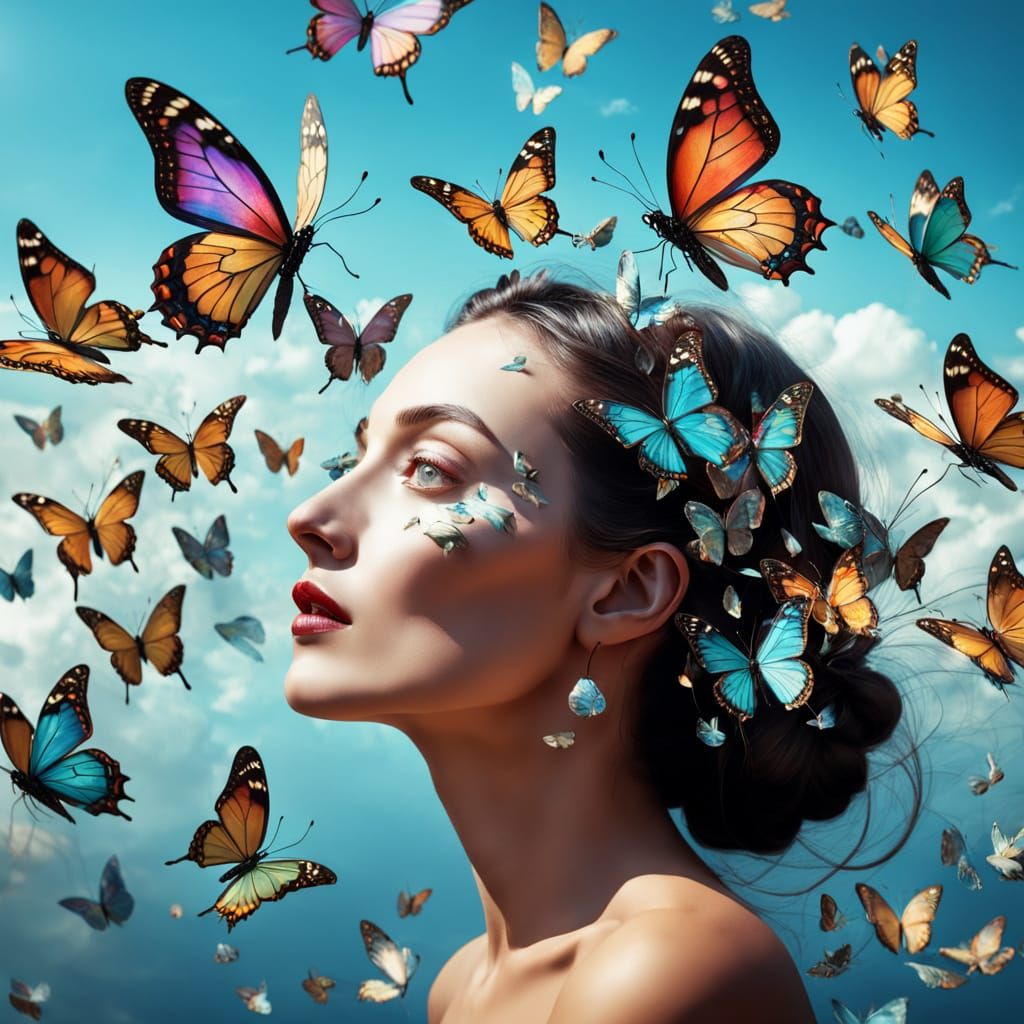 A surreal portrait of a woman with butterflies forming a floating city above her head. The image evokes a dreamlike atmosphere with soft pastel light and delicate colors, reminiscent of Salvador Dali.