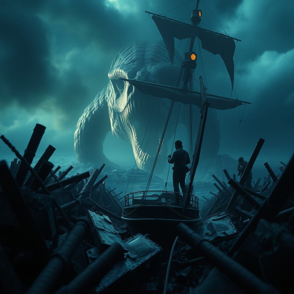 This image shows the Flying Dutchman sailing through wreckage, captained by Davy Jones, with a kraken below. The scene is dramatic and cinematic, reminiscent of digital concept art.