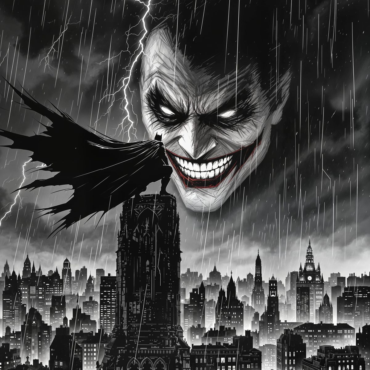 A haunting black and white illustration of Batman perched on a gothic cathedral, overlooking a stormy Gotham City skyline blending into a vivid Joker's face in the background clouds.