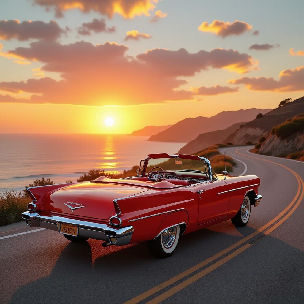 A striking picture of a classic 1960s convertible parked on a scenic coastal road as the sun sets. The image features a vibrant color palette and atmospheric lighting, in a retro-futuristic aesthetic.