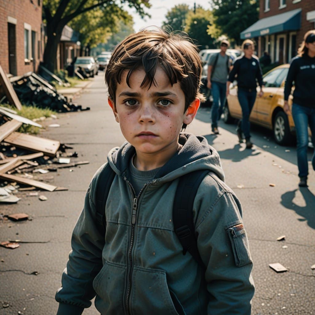 This image shows a surreal and unsettling scene of a child inside a vase at night, with a subtle reference to a bathroom setting. The artwork blends elements of fantasy and realism in a thought-provoking composition.