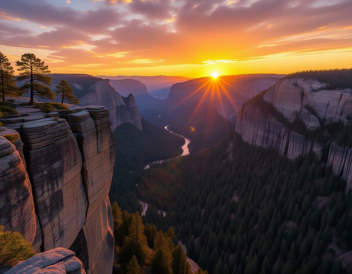 A breathtaking vista of a forest canyon from above. The scene features a stone cliff with trees, a vibrant sunset, and water visible below, reminiscent of landscape photography with high dynamic range and clarity.