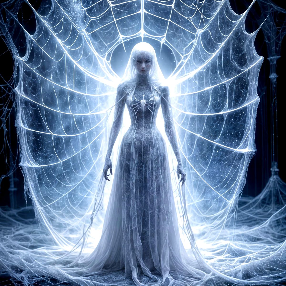 This image shows the personification of an arachnid ghost emerging from an intricate, transparent silk web. Captured in a hypermaximalist, silver nitrate photography style with scifi and macabre elements.