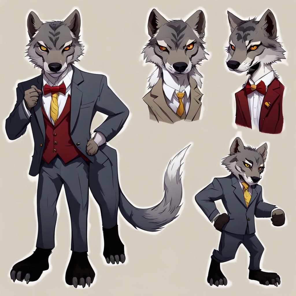This image shows an anthropomorphic grey wolf protectively holding a clouded leopard cub. The wolf, tall and slender, wears a white suit and appears angry in this detailed digital painting.