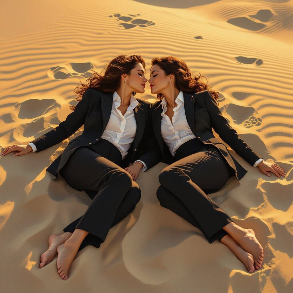 This digital painting captures a serene moment of two women in business attire falling onto sand at sunset, sharing a kiss. The artwork features elegant poses and flowing lines, reminiscent of Art Nouveau and classic illustration styles, with a warm color palette.