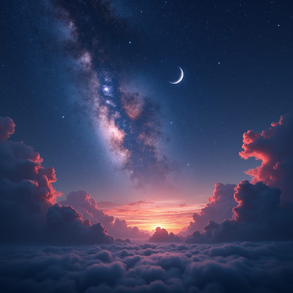 A breathtaking image of a night sky filled with stars and a crescent moon, evoking a sense of wonder. The image is rich in color with an ethereal glow, reminiscent of surrealist art.